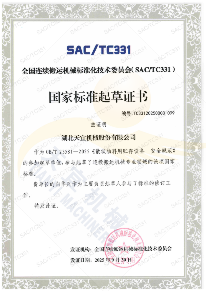 Сертификат о разработке национального стандарта на оборудование для хранения сыпучих материалов