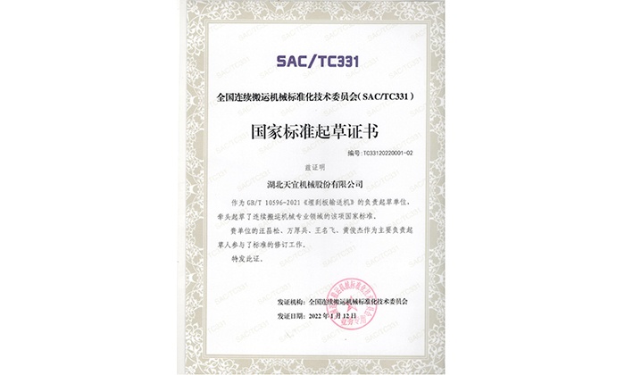 Был утвержден и выпущен национальный стандарт "Классификация, условное обозначение, характеристики и метод испытаний оборудования для непрерывной обработки сыпучих материалов" (GB/T35017-2018), в разработке которого принимала участие компания.